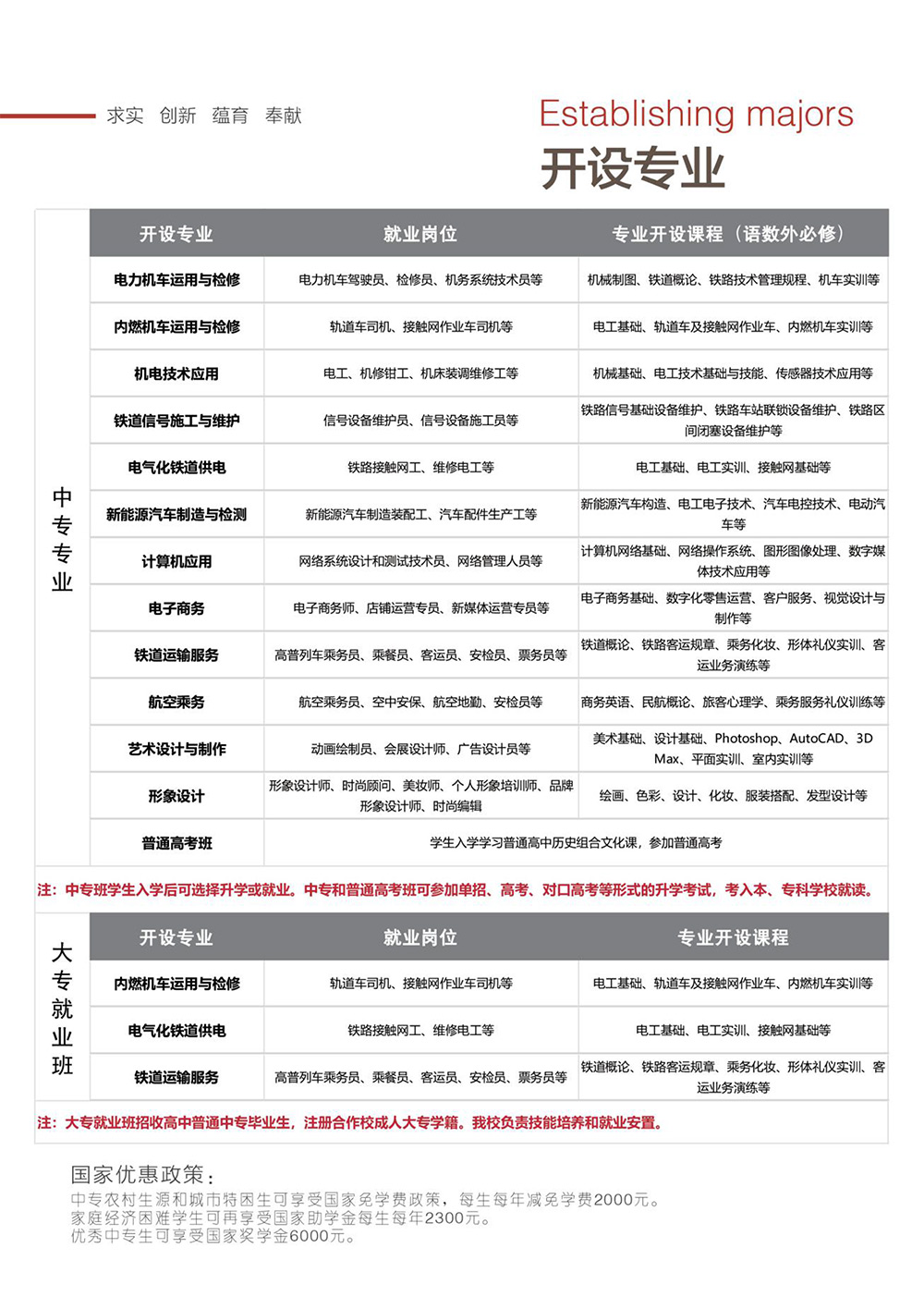 招生专业主要有:铁路类的电力机车运用与检修、内燃机车运用与检修、机电技术应用、铁道信号施工与维护、工业机器人技术应用、电气化铁道供电、新能孺源汽车制造与检测、计算机应用、电子商务、铁道运输服务、航空乘务、艺术设计与制作、幼儿保育(原学前教育)、形象设计。